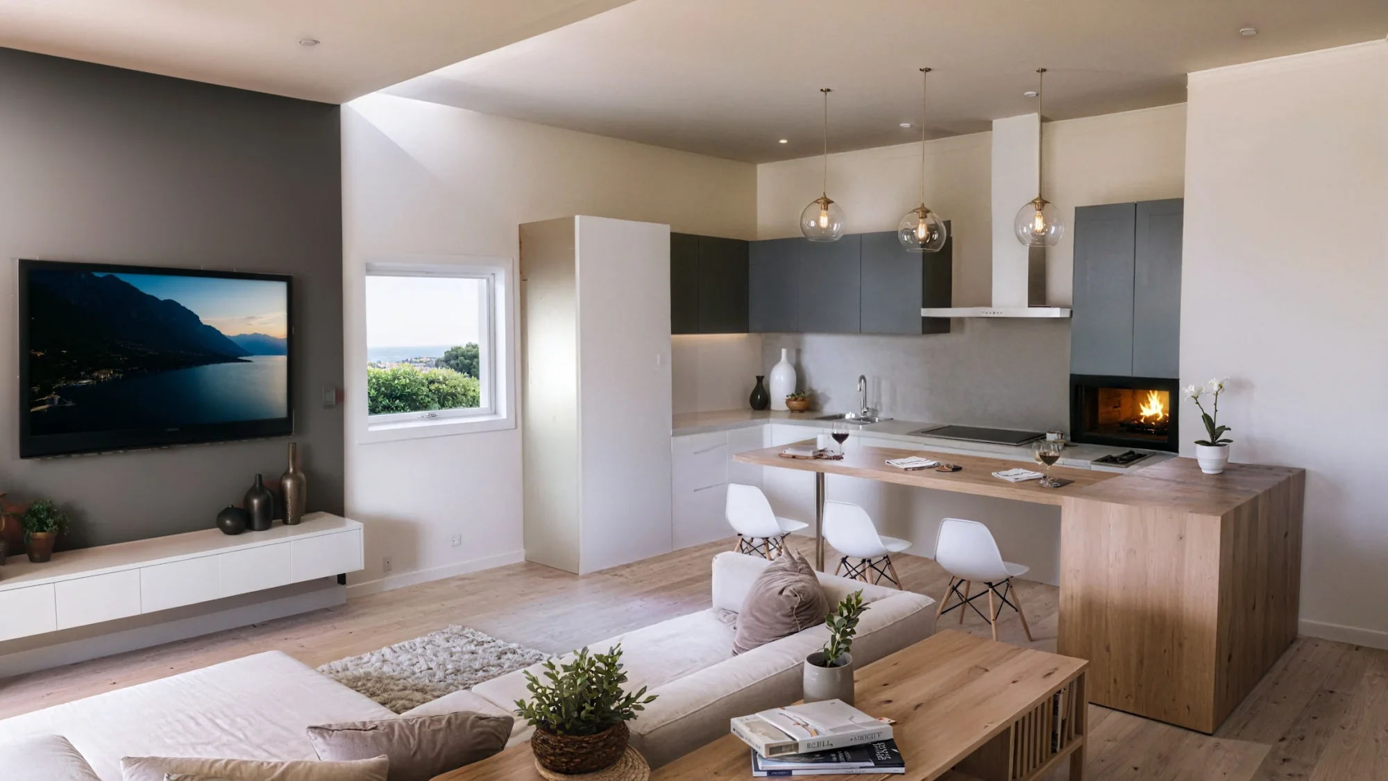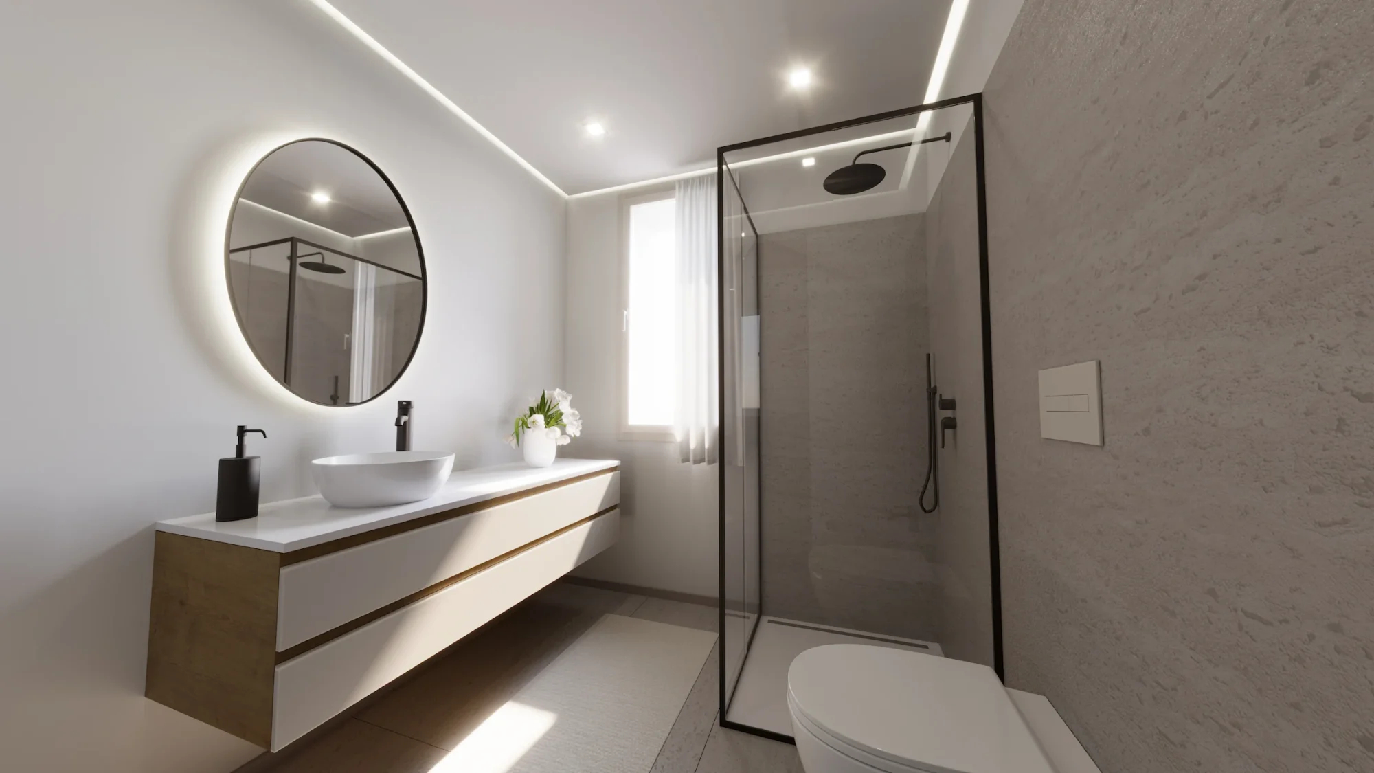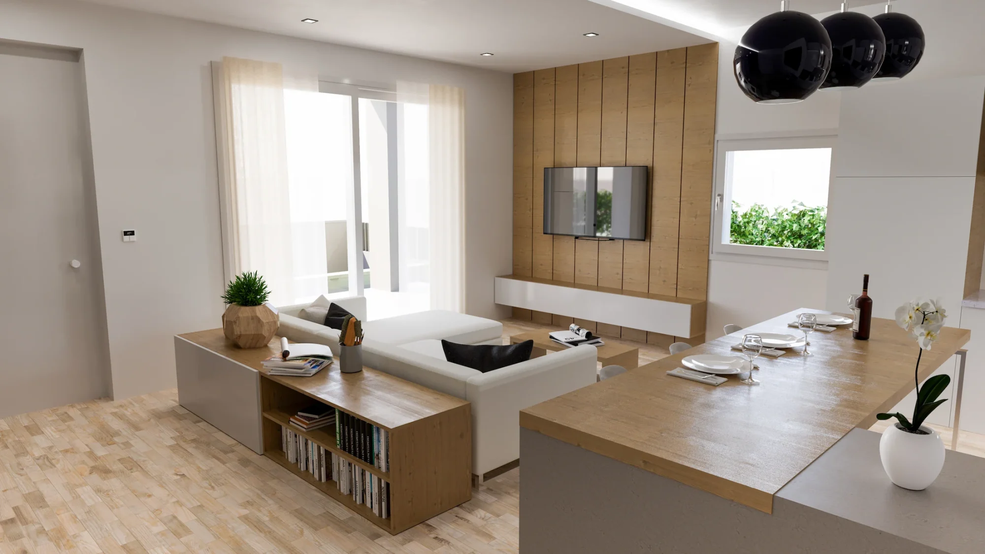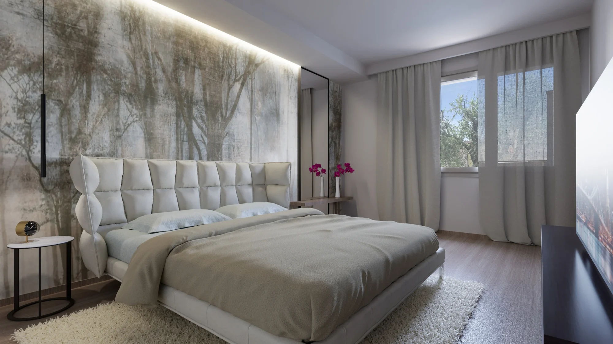 The clear separation between living and sleeping areas ensures comfort and functionality, while the residential context is enriched by a shared swimming pool and garden, designed for leisure and relaxation in every season.